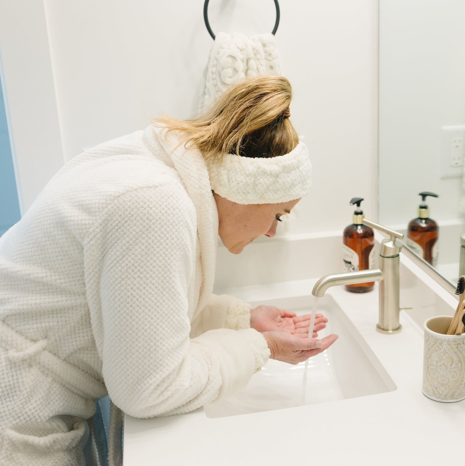 Say goodbye to hair in your face and water dripping down your arms with our headband and wristband set. Using our headband your hair will remain dry and clean throughout your skincare routine. The non-drip wristbands will leave sleeves and countertops dry by eliminating excess water.